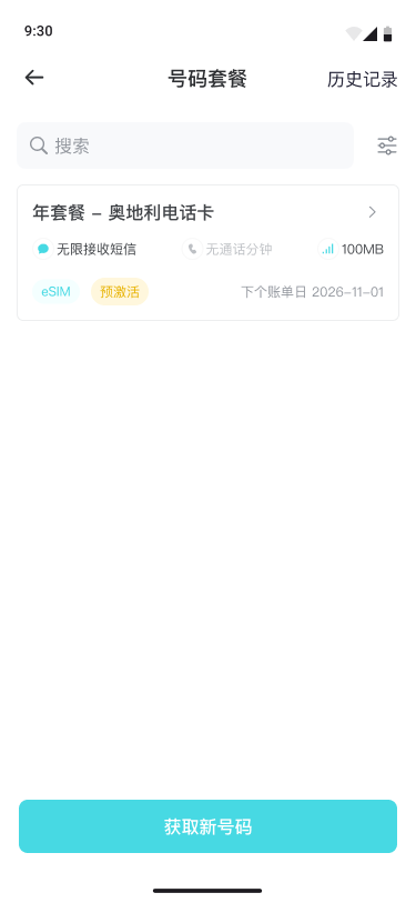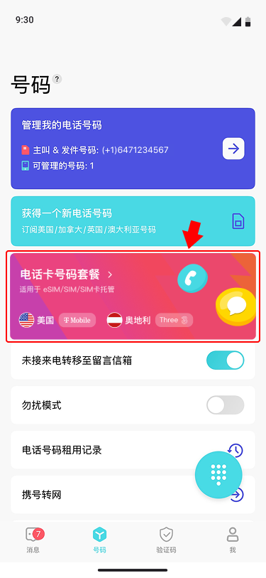 - 进入号码页卡 > 电话卡号码套餐