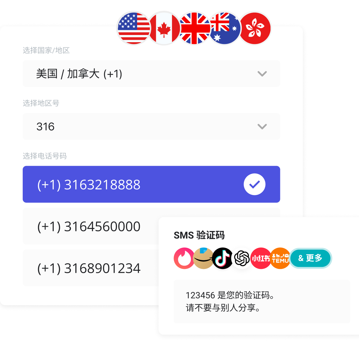 获取美国、加拿大、英国、澳大利亚及香港的本地电话号码,为您提供针对这些地区量身定制的无缝通信和验证服务。